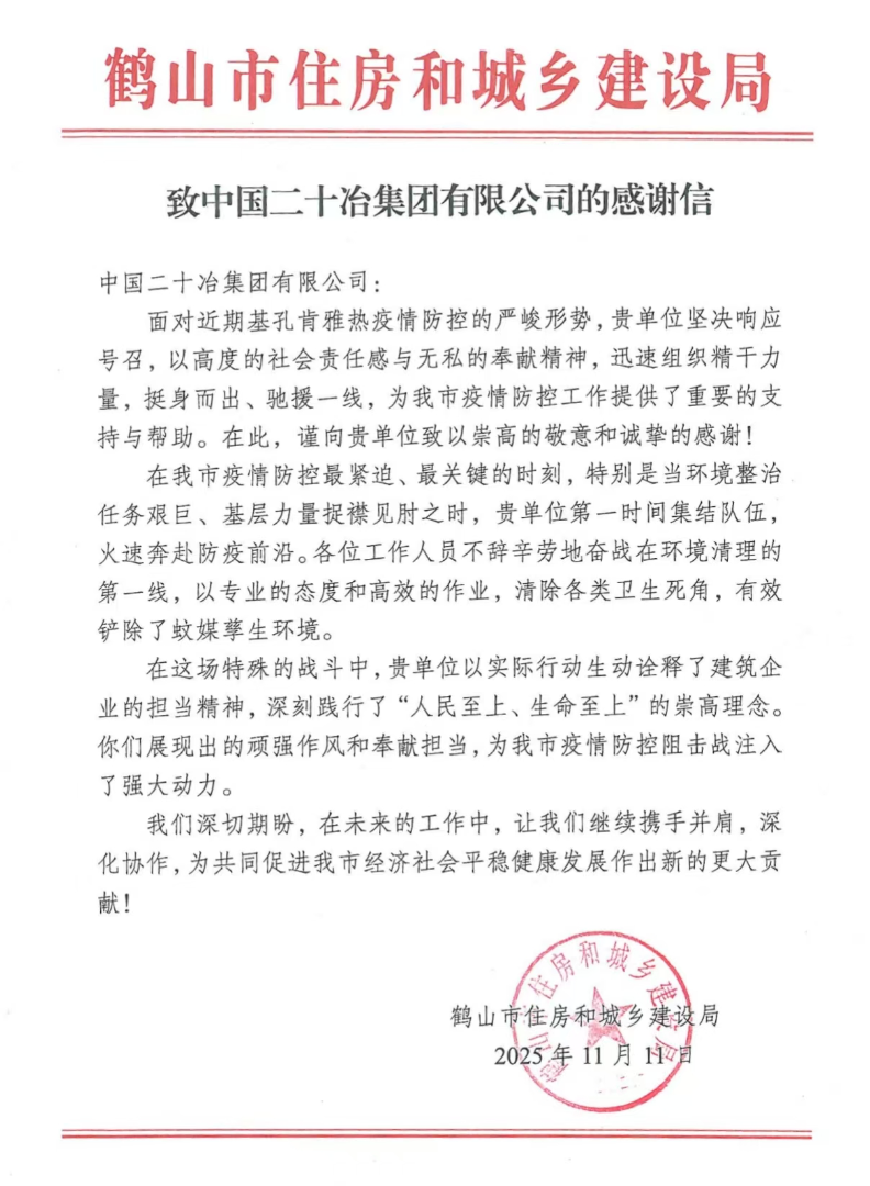 11月18日,深圳二十冶中歐班列喂給站智慧物流基地項目收到鶴山市住房和城鄉建設局感謝信。