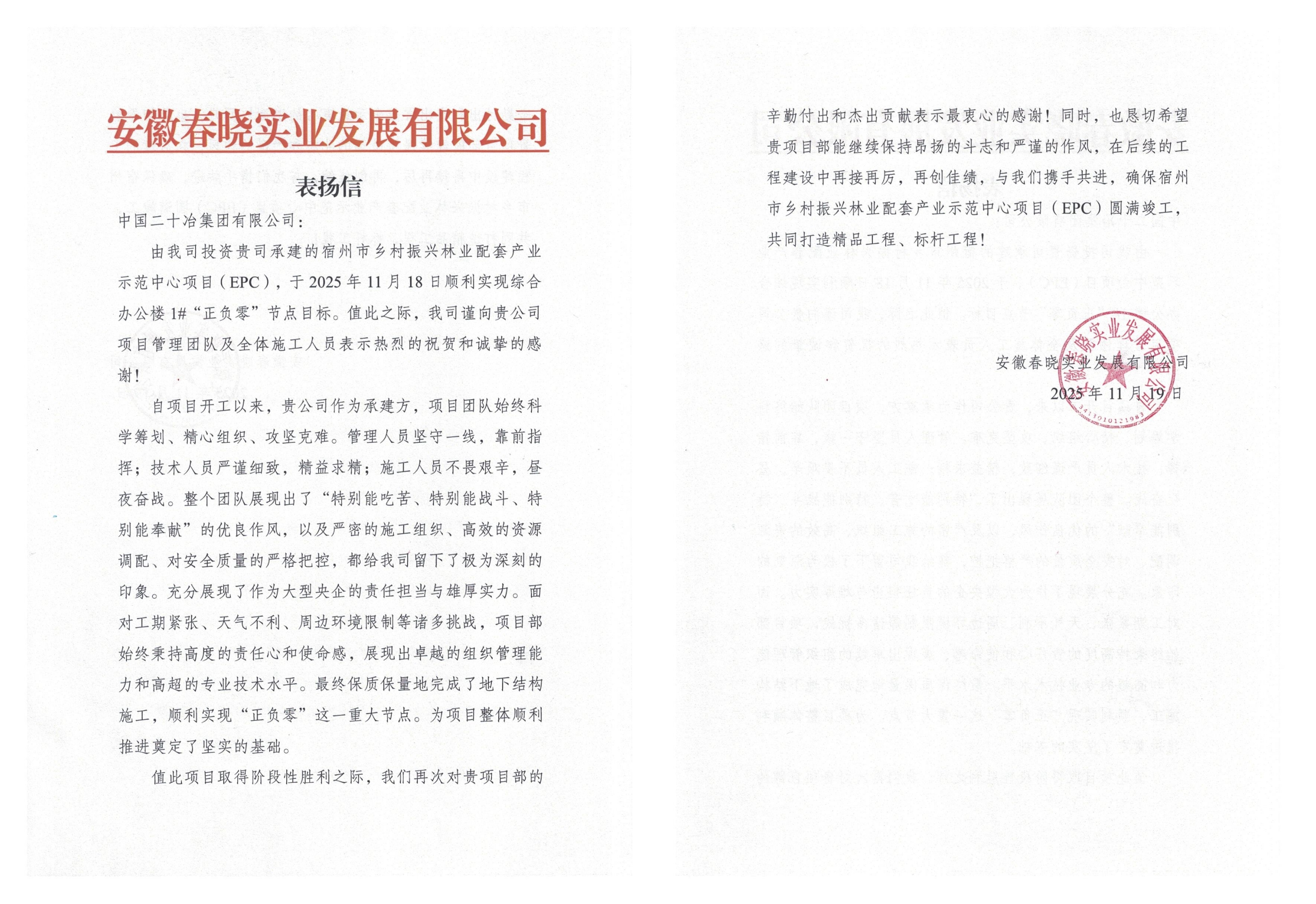11月24日,安徽二十冶承建的宿州市鄉村振興林業配套產業示范中心項目(EPC)收到業主方安徽春曉實業發展有限公司發來的表揚信。