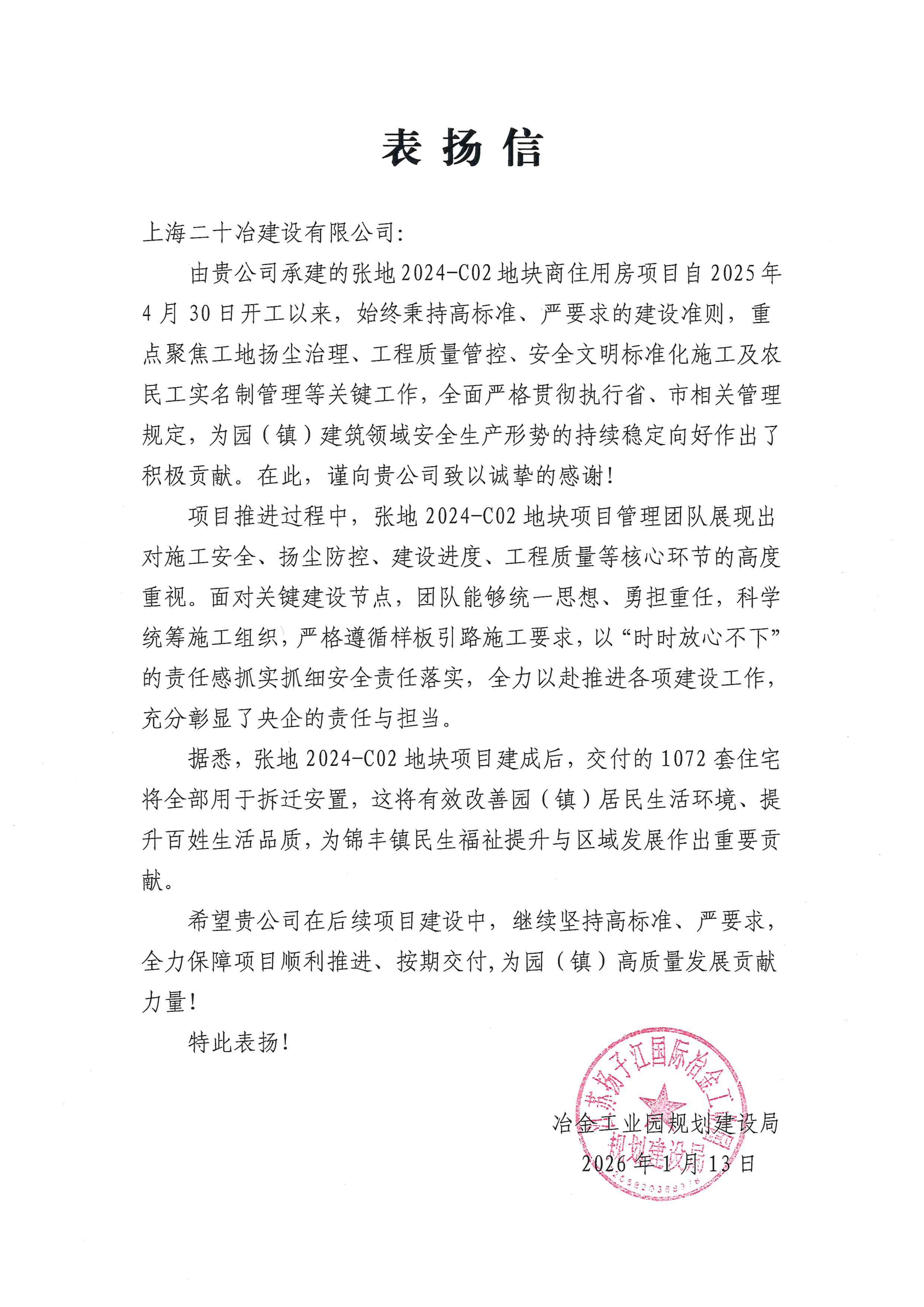 1月13日,上海二十冶張家港冶金工業園(錦豐鎮)安置房商住地塊聯動開發項目收到張家港冶金工業園規劃建設局發來的表揚信。