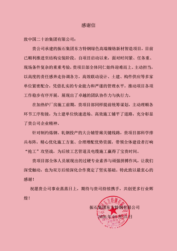 1月15日,由冶金工業公司承建的振石集團東方特鋼綠色高端鎳鉻新材智造項目,收到來自業主單位振石集團東方特鋼有限公司發來的感謝信。