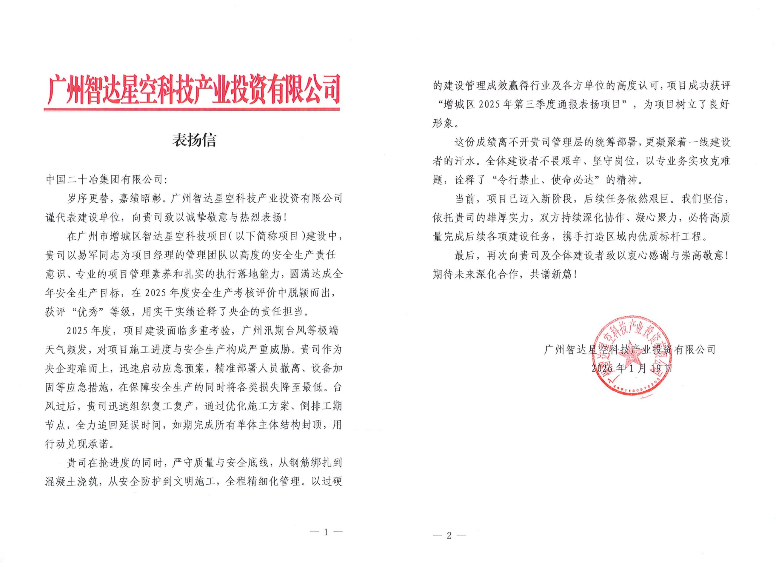 1月22日,建設(shè)安裝公司收到廣州智達(dá)星空科技產(chǎn)業(yè)投資集團(tuán)發(fā)來(lái)的感謝信,對(duì)項(xiàng)目團(tuán)隊(duì)在廣州增城區(qū)智達(dá)星空科技項(xiàng)目建設(shè)中所展現(xiàn)出的攻堅(jiān)克難精神與高效履約能力給予高度贊揚(yáng)。