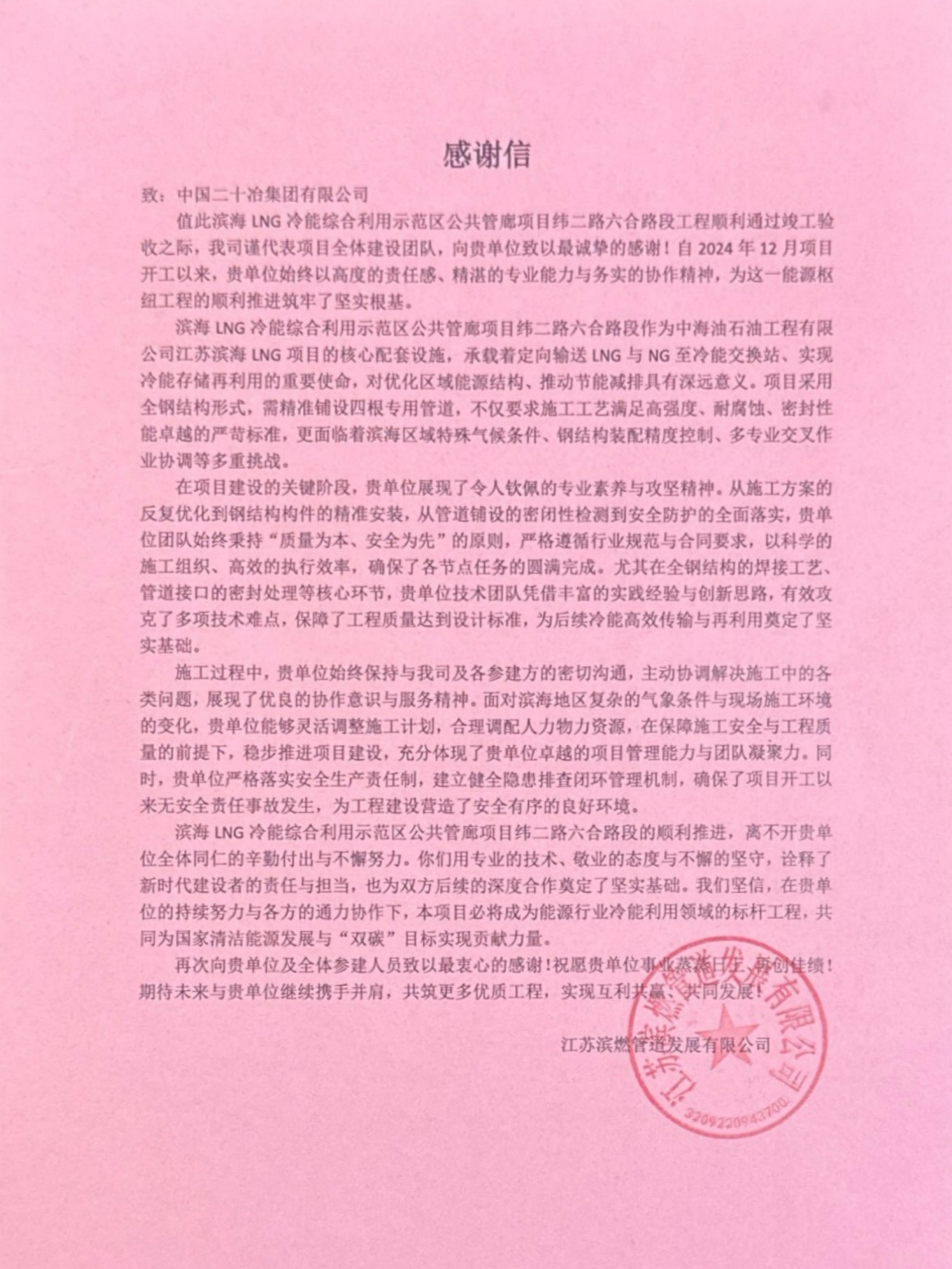 1月20日,由市政公司承建的濱海LNG 冷能綜合利用示范區(qū)公共管廊項(xiàng)目緯二路六合路段工程,收到業(yè)主單位江蘇濱燃管道發(fā)展有限公司發(fā)來(lái)的感謝信。信中對(duì)項(xiàng)目圓滿(mǎn)通過(guò)竣工驗(yàn)收給予高度贊譽(yù),向全體參建人員的專(zhuān)業(yè)匠心、責(zé)任擔(dān)當(dāng)與高效協(xié)作致以最誠(chéng)摯的感謝。