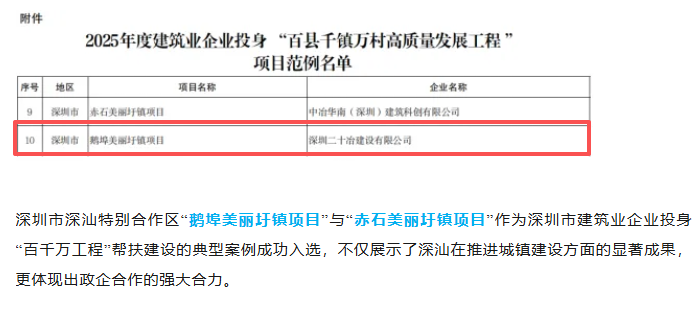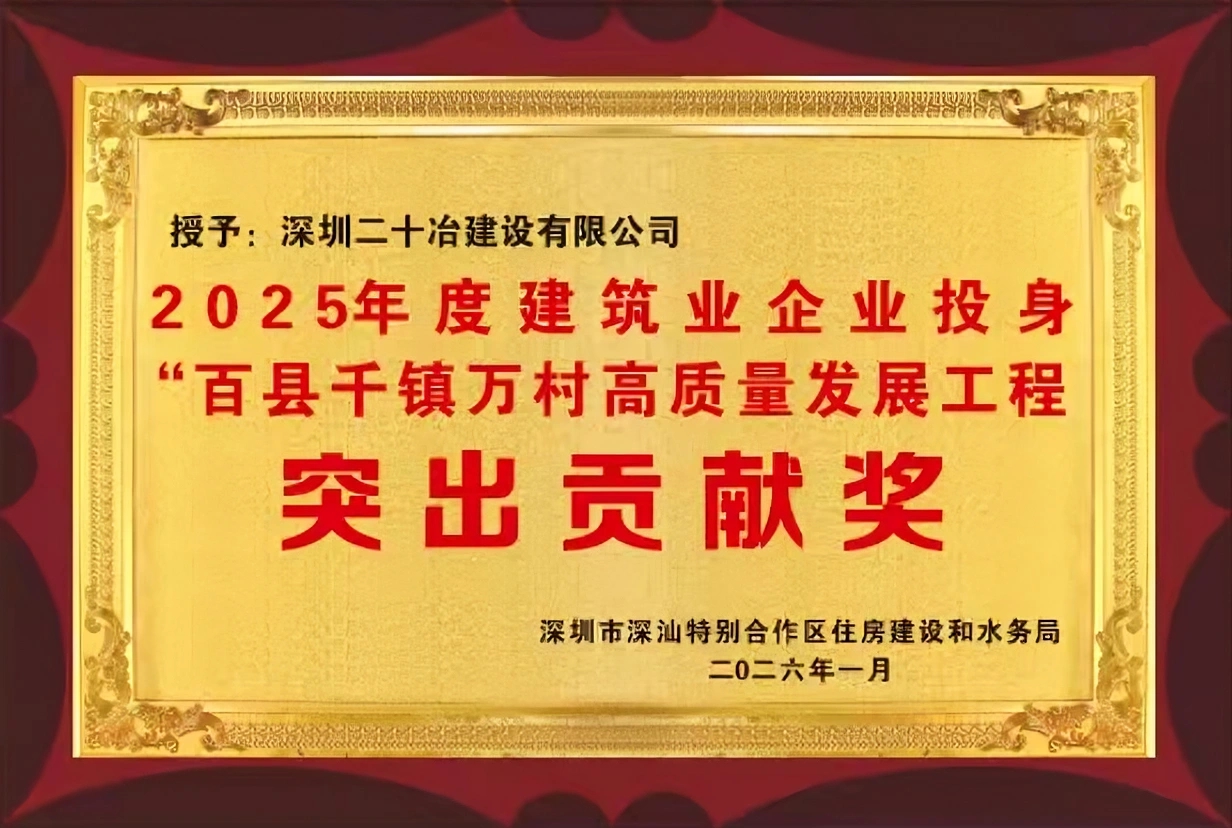 1月26日,深圳二十冶承建的鵝埠美麗?ài)祖?zhèn)項(xiàng)目被廣東省“百縣千鎮(zhèn)萬(wàn)村高質(zhì)量發(fā)展工程”指揮部城鎮(zhèn)建設(shè)專(zhuān)班辦公室列為2025年度建筑業(yè)企業(yè)投身“百縣千鎮(zhèn)萬(wàn)村高質(zhì)量發(fā)展工程”項(xiàng)目范例。深汕特別合作區(qū)黨工委、管委會(huì)官方微信公眾號(hào)同步報(bào)道此事,對(duì)項(xiàng)目為全省“百千萬(wàn)工程”建設(shè)做出的貢獻(xiàn)力量表示肯定。該項(xiàng)目還獲得了深圳市深汕特別合作區(qū)住房建設(shè)和水務(wù)局頒發(fā)的2025年度建筑業(yè)企業(yè)投身“百縣千鎮(zhèn)萬(wàn)村高質(zhì)量發(fā)展工程”突出貢獻(xiàn)獎(jiǎng)。