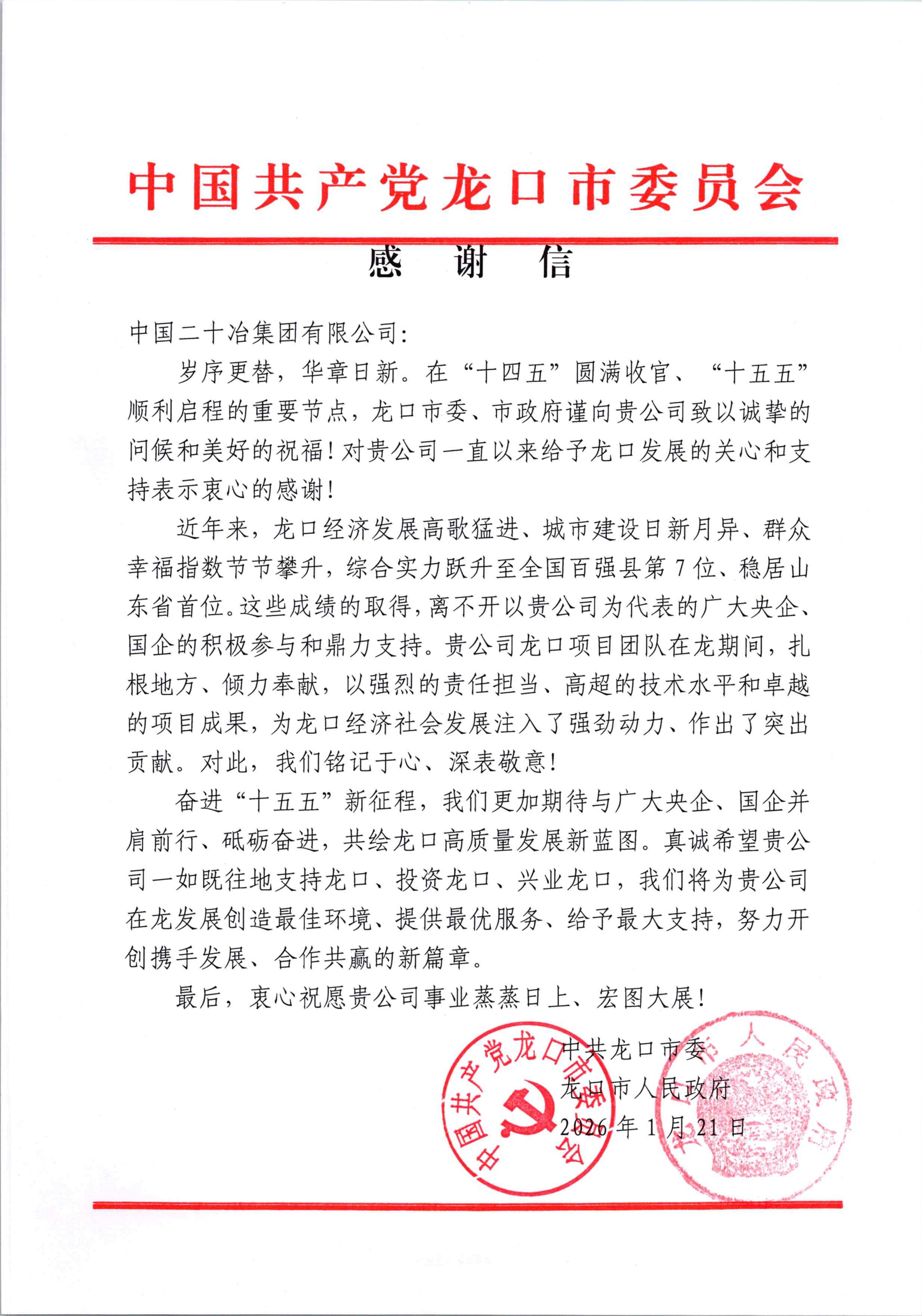 1月27日,市政公司收到中共龍口市委、龍口市人民政府發(fā)來(lái)的感謝信。